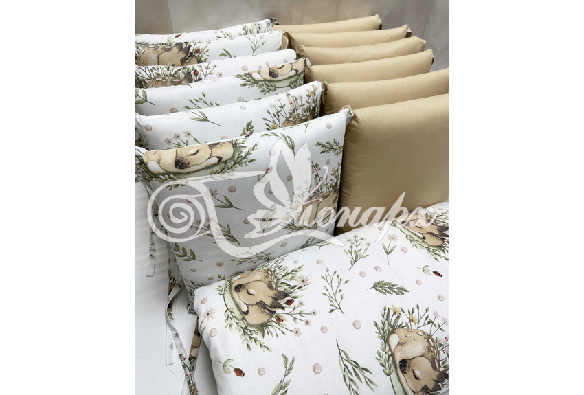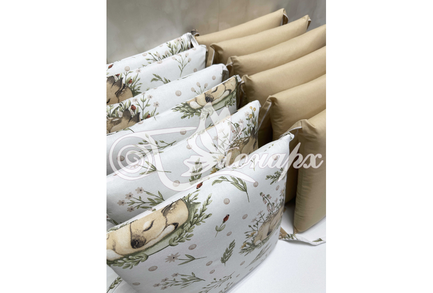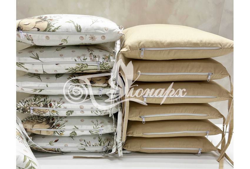Бортик составной: 12 подушек 31х34 см на замочках упакованы в сумку-переноску.