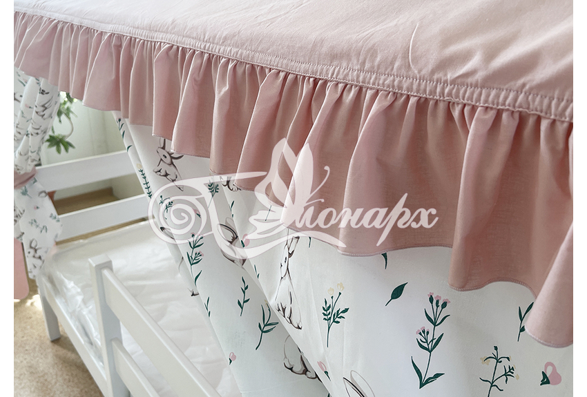 ширина - 137 см + 24 см на рюши (по 12 см на одну сторону). - Занавески с завязками (по 4 завязки на каждой занавеске) на переднюю сторону кроватки 2 шт.: