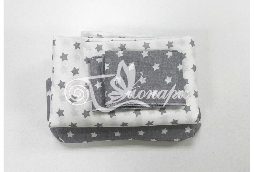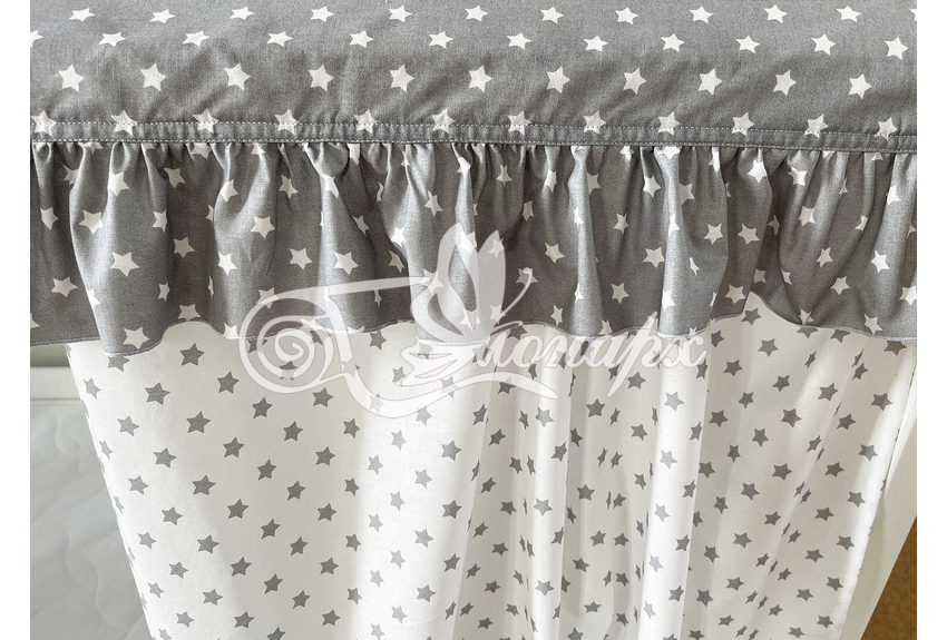 ширина - 137 см + 24 см на рюши (по 12 см на одну сторону). - Занавески с завязками (по 4 завязки на каждой занавеске) на переднюю сторону кроватки 2 шт.: